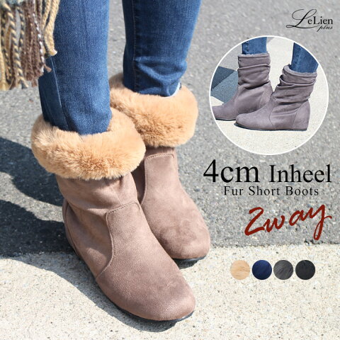 【3,990円選べる福袋対象】2WAYインヒールファーブーツ 4.5センチヒール レディース 秋冬 ブラック グレー ネイビー ブラウン 25.0 あったか ショート スエード 低反発 ラウンドトゥ スエード 歩きやすい 防寒 大きいサイズ 黒